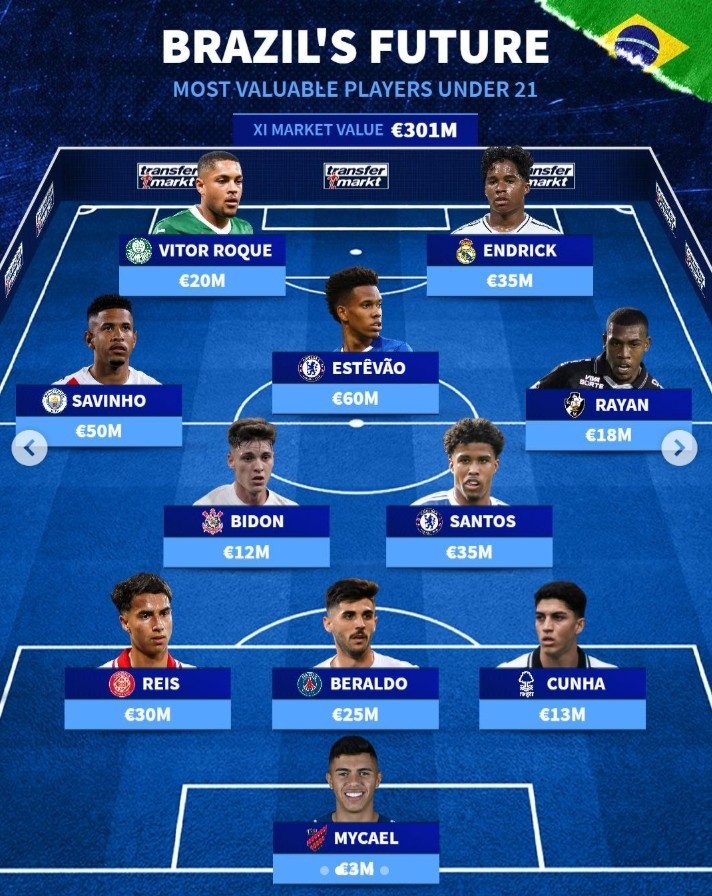 巴西U21最贵阵:埃斯特旺6000万欧最高,罗克、恩德里克突前